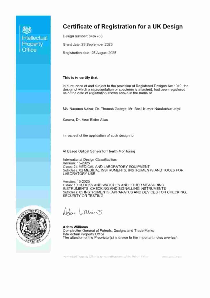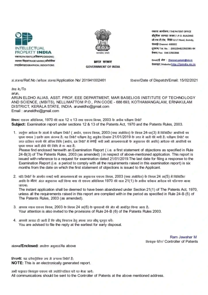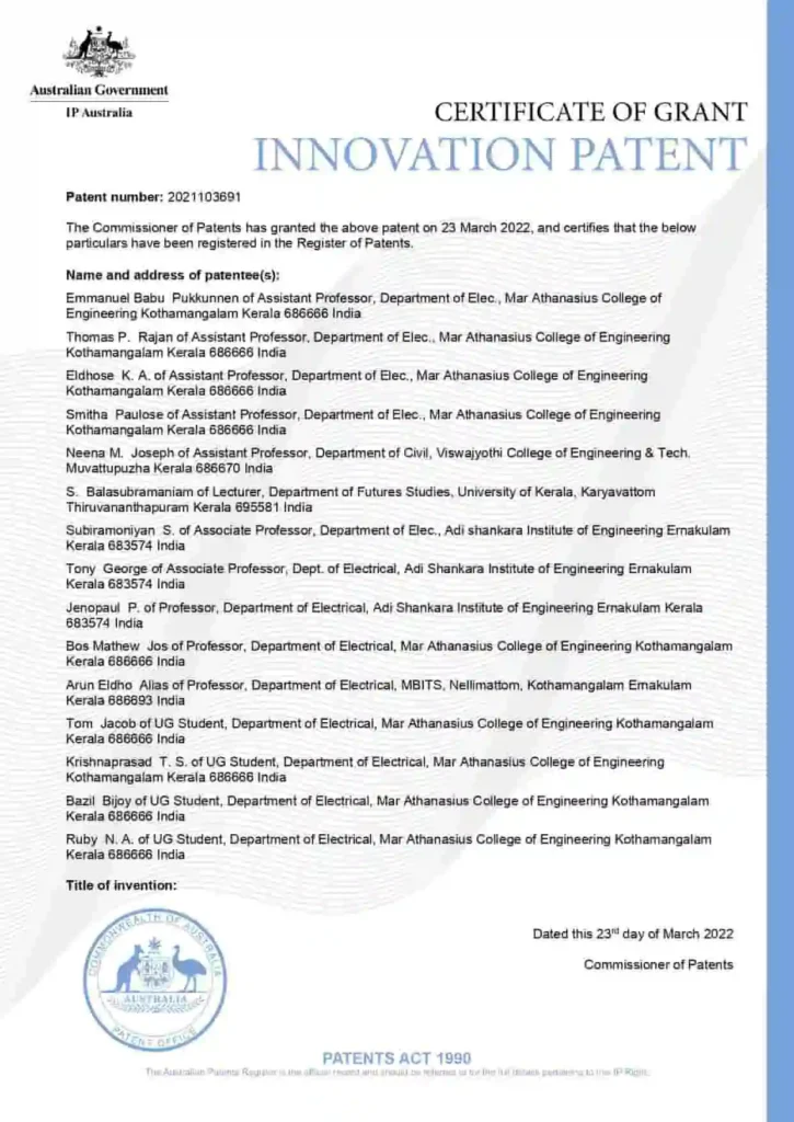 Patents awarded to Dr Arun Eldho Alias, CEO Renvolt Energy Solutions for Electric Vehicle and Renewable Energy projects including Solar Car.